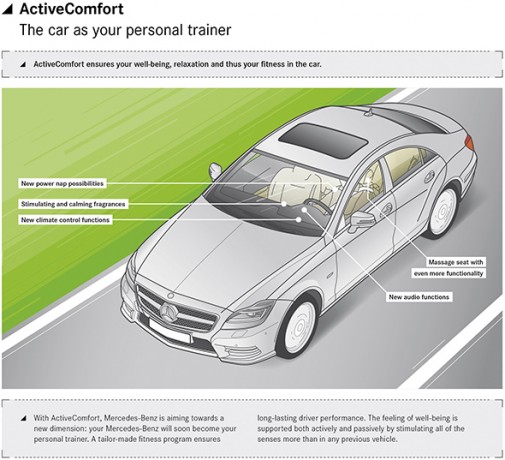 Active Comfort sees Mercedes-Benz opening up a new dimension. “The Mercedes-Benz becomes a personal coach”, explains Jörn Petersen, Head of Human Factors at Daimler AG. A tailor-made fitness programme keeps the driver in good shape to master the demands of driving the vehicle on a sustained basis.