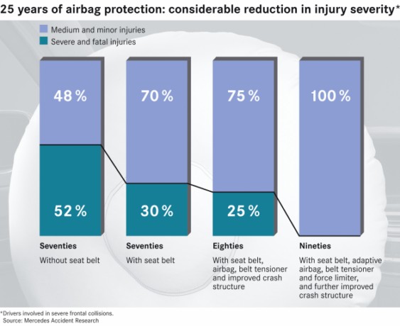 Mercedes-Benz has continued to improve its integrated safety systems with numerous innovations. In todays Mercedes cars the airbags and seat belts combine with the belt tensioners and belt force limiters to create a complex restraint system for fully integrated safety.