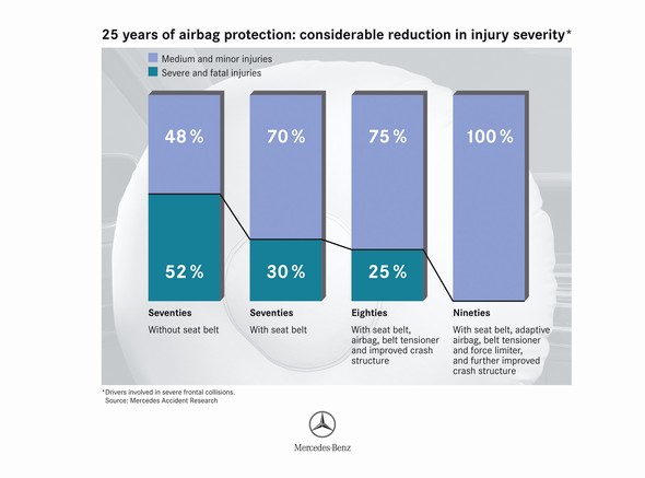 The airbag is intended as a complement to the seat belt, by no means as a replacement. This was already clear to the developers at Mercedes-Benz when they began their research for the airbag in 1967.