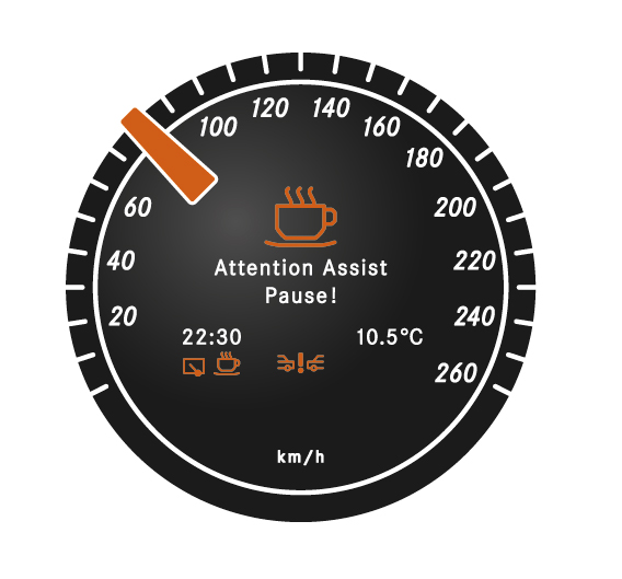 This enables the system to recognise the typical signs of overtiredness and warn the driver accordingly. This is done by an acoustic signal and a display in the instrument cluster with the clear-cut advice: “Attention Assist. Break!”