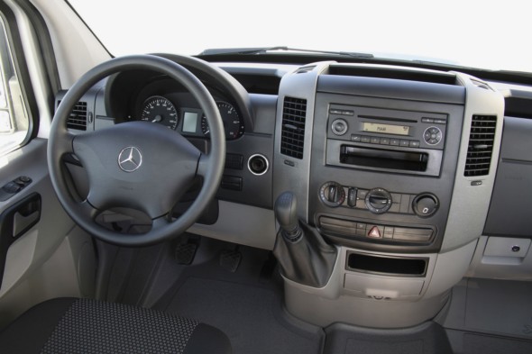In the cab, the eye was drawn above all to the redesigned, curved instrument panel. In its design and the quality of its material it attained passenger car standard, especially in the Sprinter crewbus variants with a soft, leatherlike surface (“Softlook”), available for the other Sprinters as an optional extra. Along with added comfort details such as a cup holder and stowage facilities, particularly the shift lever in the form of a joystick caught attention. Positioned within easy reach on the centre console, it permitted full through-cab access.
