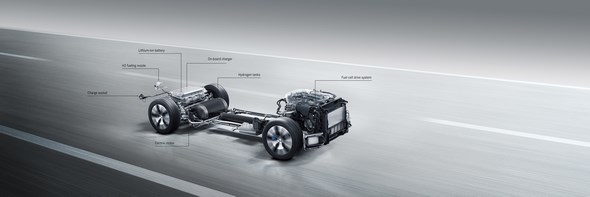 The electrical powertrain generates a total peak output of 200 kW (272 hp). The electric hybrid system has a total range of 1100 kilometres, of which some 200 kilometres can be driven on the especially powerful and compact high-voltage battery, and around 900 kilometres on the electricity produced in the fuel cell. The design provides for the use of CFRP pressure tanks for hydrogen storage.
