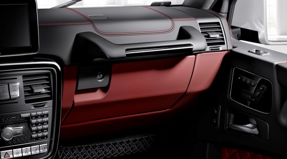Other interior details include the coloured seat belts in designo red and the leather-covered grab handles on the roof liner. In short, individuality virtually knows no bounds on-board the G-Class.