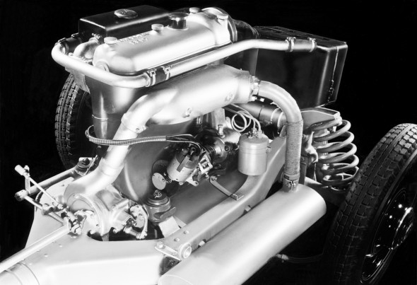 The two-seater Mercedes-Benz 150 Sports Roadster presented in 1935 is based on the engineering of the 150 Sports Saloon. It also has a mid-engine: to improve axle load distribution the drive unit engine-cum-transmission is rotated through 180 degrees; the engine is in front of the rear axle, the transmission behind it. Compressed air cooling enables the use of a smaller radiator since an engine-driven, encapsulated fan forces the cooling air through the radiator. The small rectangular radiator is located behind the engine, over the rear axle.