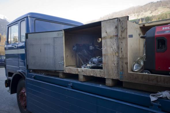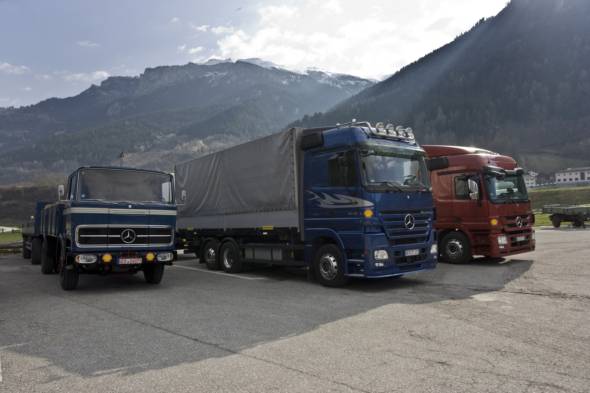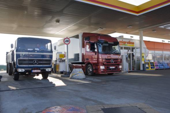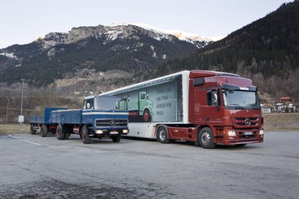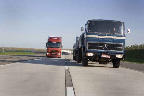 The two test vehicles were worlds apart: a modern Actros semitrailer/tractor combination rated at 440 hp competing against a 200 hp LP 1620 with trailer. The two vehicles are separated by around 50 years of progress resulting from development work in the field of commercial vehicles.