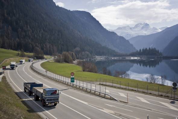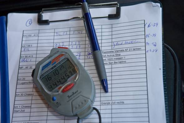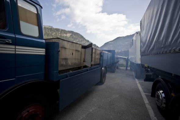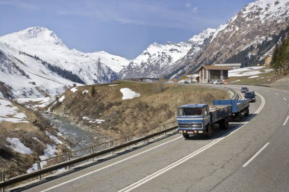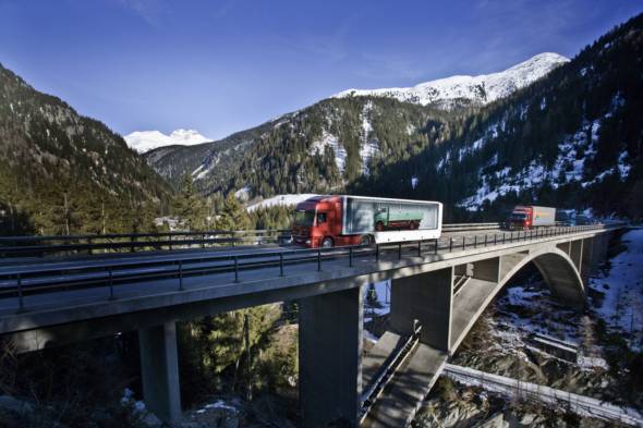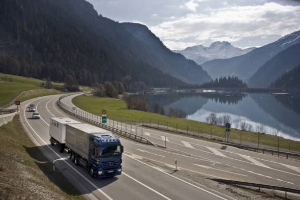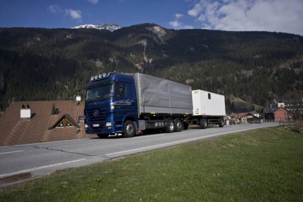 The comparative test drive began in the early morning. The starting point was the main gate of the Daimler assembly plant in Wörth. The tour was 542 kilometres long, leading via Stuttgart over the San Bernardino pass to the Swiss village of Lostallo.