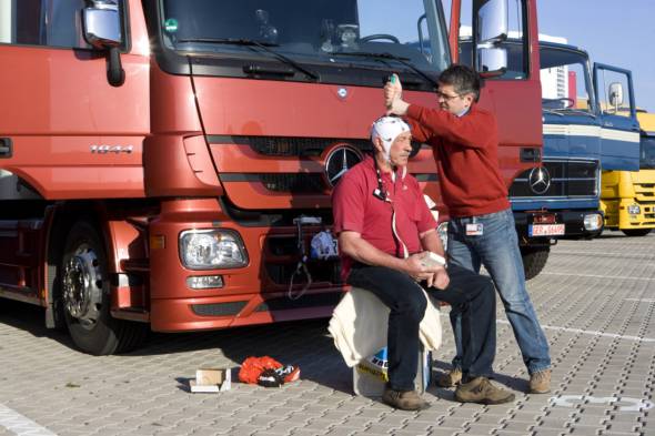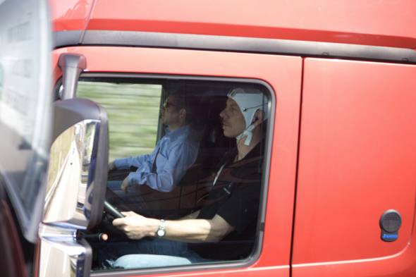 In the test “Actros versus LP 1620” the Daimler development engineers took a close look not only at the vehicles, but at the drivers, too. The test conditions called for professional drivers with decades of truck-driving experience. The selected “contestants” were aged 56 and 49, as the test was also intended to provide findings on whether age plays a decisive role with regard to the physical and mental stress involved in driving a truck.