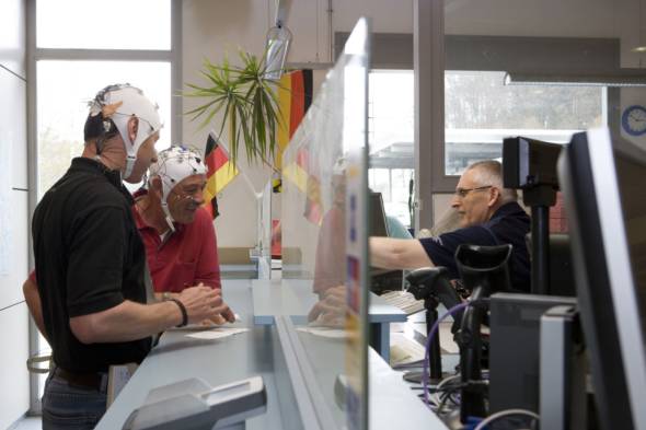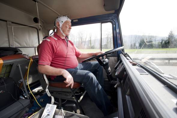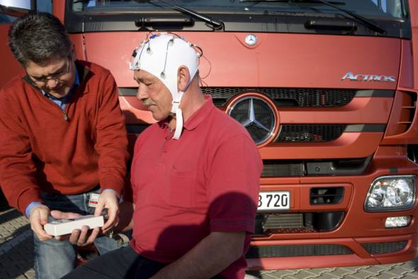 Before the Actros and the LP 1620 hit the road, the drivers each donned an EEG cap fitted with 16 sensors to record their brain waves during the trip. The measurements began exactly half an hour after setting off for Lostallo, because for all the drivers’ professional experience, the Daimler researchers wanted to be sure that the test candidates had adjusted to the test conditions and rid themselves of any initial nervousness.