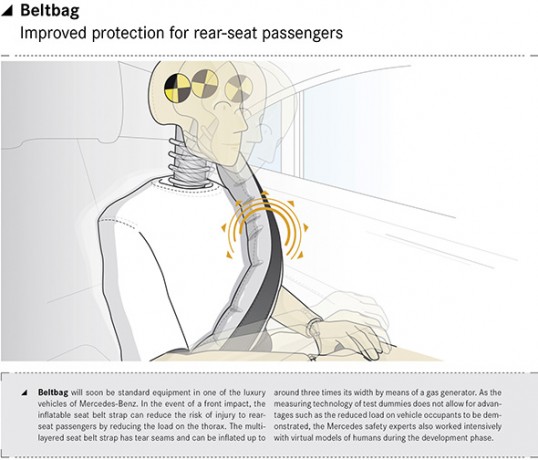 | Beltbag: reduces the risk of injury to passengers in the rear. This inflatable seat-belt strap is able to reduce the risk of injury to passengers in the rear in a head-on collision by lessening the strain placed on the ribcage. Should the crash sensors detect a severe frontal impact, the airbag control unit will trigger deployment and inflation of the beltbag. A gas generator then inflates the multi-layered belt strap with Velcro seams to nearly three times its normal width. The resulting larger surface area is able to better distribute the force acting on the seat occupant, thereby reducing the risk of injury. |