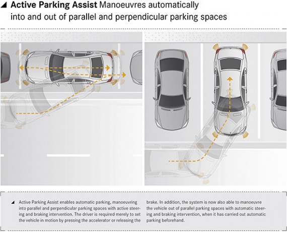 The Active Parking Assist is designed for automated parking with active steering and brake control in both parallel and perpendicular spaces. It is an advanced version of the PARKTRONIC system with Parking Guidance offered previously.