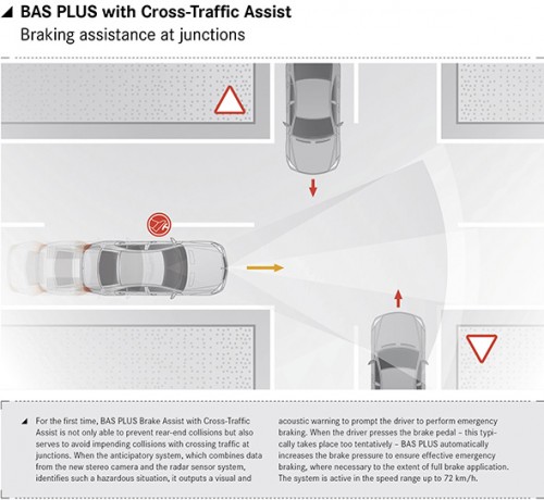 Apart from material damage, accidents at junctions often result in serious personal injuries, too. The new Brake Assist BAS PLUS from Mercedes-Benz is therefore capable of more than just helping the driver to avoid collisions with vehicles ahead or lessen their consequences in a purely longitudinal direction: the new Cross-Traffic Assist function can also come to the driver’s aid when there is a risk of a collision with cross traffic at junctions.