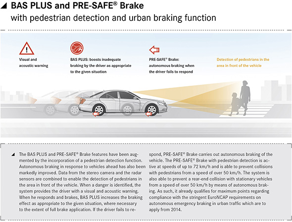 Pedestrian detection has been added to the BAS PLUS and PRE-SAFE® Brake functions, while autonomous braking for vehicles in front has undergone a major advance, too.