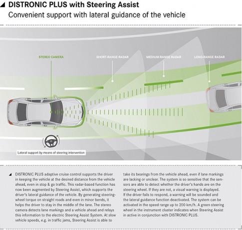 The DISTRONIC PLUS adaptive control system is a driver aid designed to keep the vehicle at the desired distance from another vehicle in front that is travelling slower than the selected cruising speed. This radar-based function has now been enhanced by the addition of Steering Assist, which helps drivers to stay centred in their lane by generating the appropriate steering torque when travelling on a straight road and even in gentle bends.
