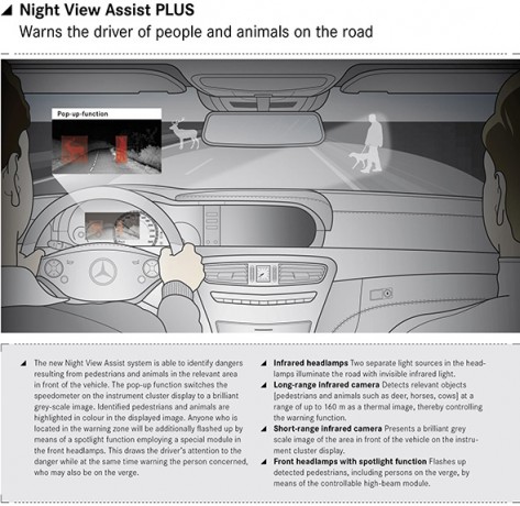An additional (far) infrared sensor in the radiator grille supplements the proven Mercedes-Benz night vision technology. It is able to detect pedestrians at a distance of up to160 metres, and animals such as deer, horses and cattle at up to100 metres.