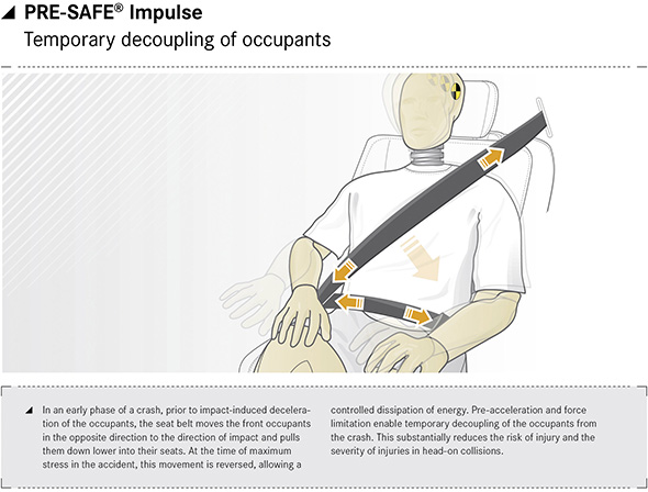 | PRE-SAFE® Impulse: at an early phase of the crash, before the resulting deceleration starts to increase, the front occupants are pulled away from the direction of impact and deeper into their seats by their seat belts. By the time the accident enters the phase when loads peak, the extra distance they are retracted by can be used while dissipating energy in a controlled fashion. Pre-acceleration and force limitation allow the occupants to be temporarily isolated from the effects of the crash, significantly reducing the risk and severity of injuries in a frontal collision. With PRE-SAFE®Impulse, the seat belt strap can be retracted by pyrotechnic means at all three belt anchorage points, and released again with controlled force. The fundamental difference compared to conventional belt tensioners is that the force for retracting the belt strap is maintained for a much longer time. The deployment logic fires the seat belt system’s belt tensioners progressively depending on the seriousness of the accident. In this way, the tensioning force can be adapted as required. |