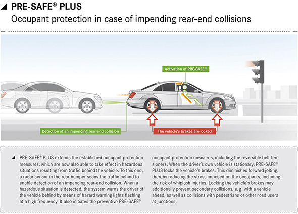 | PRE-SAFE® PLUS: occupant protection for an imminent impact from the rear. PRE-SAFE® PLUS offers an extension of the familiar occupant protection measures in situations where traffic behind poses a danger. A radar sensor in the rear bumper monitors the traffic behind the vehicle and can detect the risk of a rear-end collision. The system warns the driver of the vehicle behind by activating the rear hazard warning lights at a higher frequency than normal. Apart from this, the PRE-SAFE® anticipatory occupant protection measures, including the reversible belt tensioners, are also deployed. If the vehicle is stationary, PRE-SAFE®PLUS will keep it firmly braked. Minimising the forward jolt in this way can greatly reduce the strain placed on the occupants, such as the risk of whiplash injuries. Firmly applying the vehicle’s brakes can help to prevent secondary accidents too, such as running into a vehicle in front, for example, or colliding with pedestrians or other road users at junctions. |