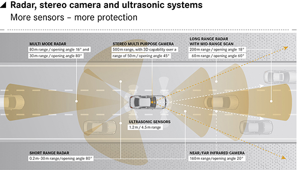 | Radar: sensor technology for picking up relevant obstacles. New improved versions of the short-range and long-range radars combine with a new multi-mode radar to detect relevant obstacles such as vehicles or people in defined areas in front of, next to and, now, behind the vehicle, too. The system employs 2 x short-range radars at the front (range 30 m, opening angle 80°), 1 x long-range radar at the front (200 m, 18°) with mid-range scan (60 m, 60°), 2 x short-range radars on the sides at the rear (30 m, 80°) and 1 x multi-mode radar at the rear (30 m, 80° and 80 m, 16°).The algorithms for the varying systems amalgamate (èdata fusion) the radar readings with the visual information from the èstereo camera. Many of the assistance systems from Mercedes-Benz work in this way, fusing complementary data sources to ensure reliable operation. |