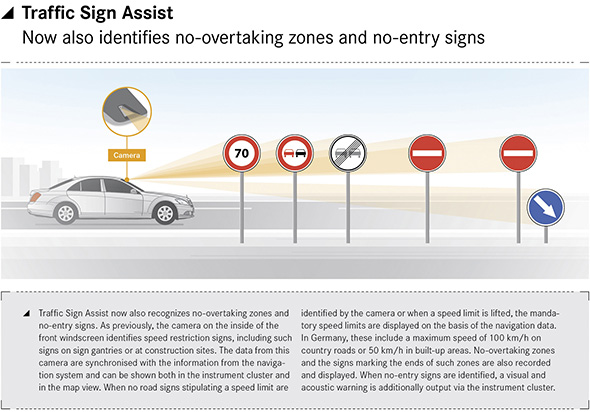 A new Traffic Sign Assist system which builds on the capabilities of the previous Speed Limit Assist represents yet another contribution to accident prevention from Mercedes-Benz. The system is now also able to recognise no-overtaking zones and alert drivers to access restrictions.
