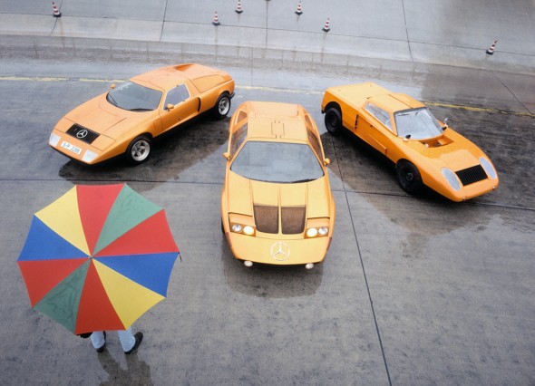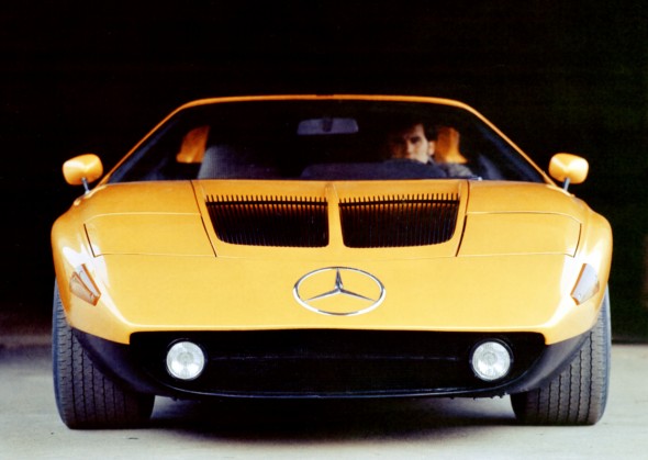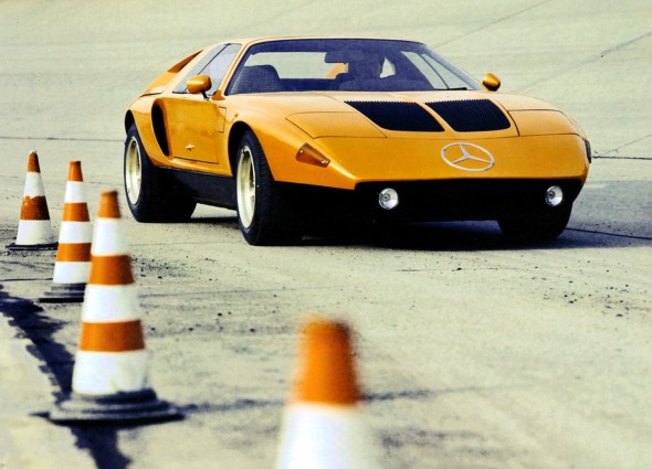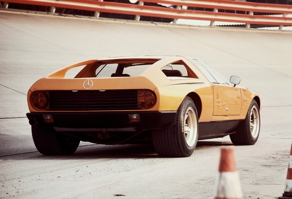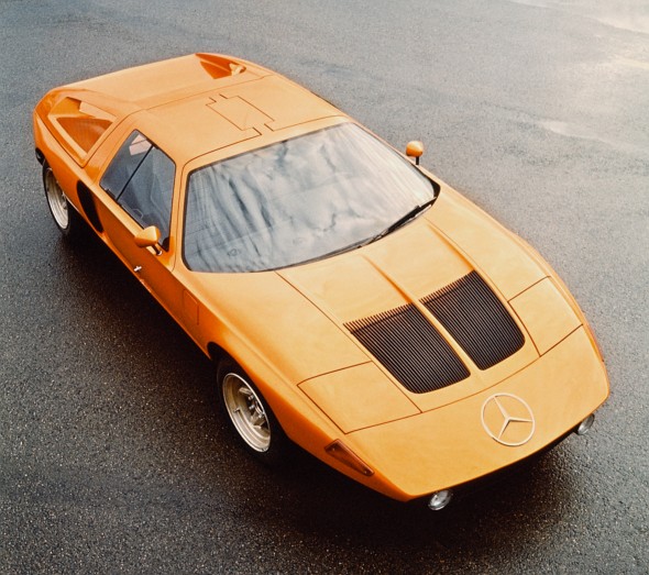 At just 1.12 metres in height, a number of details about this flat sports coupé made reference to the history of Mercedes-Benz supersports cars. Such features included the gullwing doors, reminiscent of the 300 SL, and the consistent use of innovative drive technology in a high-performance automobile. Unlike the 300 SL (spaceframe with steel and aluminium skin), however, the C 111 had a body made of glass fibre reinforced plastic, which was bonded to the steel floor assembly.
