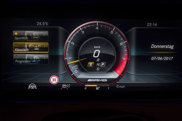 Another hallmark AMG speciality are the displays: The 31.2-centimetre TFT wide-screen colour display reproduces round dials that provide information about engine speed, vehicle speed and lots of additional data.