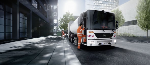 The vehicle occupants have not been overlooked either: the Econic now features three-point seat belts on all seats (second half of 2010). In addition, it comes with an axle load measuring device and acceleration slip regulation (ASR) as standard. The axle load measuring device effectively helps to prevent overloading by determining the gross vehicle weight and displaying it in the “driver information system”. The acceleration slip regulation, meanwhile, helps to ensure greater driving stability. Both of these features are significant benefits in the waste disposal sector, particularly since it is possible for the vehicle to become overloaded inadvertently, a situation which can both damage the chassis and have an impact on overall safety. ASR also helps to avoid problems in winter or slippery conditions. In the past the Econic already came equipped as standard with a differential lock on the drive axle, as well as a planetary axle – which has the effect of building up torque at the wheels. When combined together, these two design features give the Econic excellent traction, something which is particularly appreciated in winter by those customers faced with difficult operating conditions.