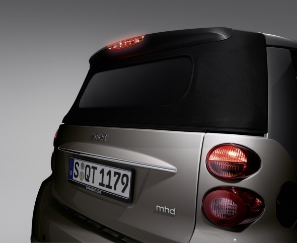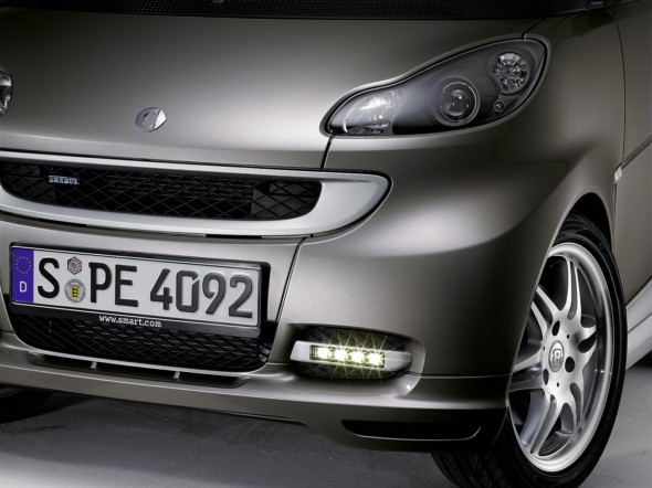 with all standard main headlights. smart drivers can choose between two versions: with LED lamps in chrome or in black. The trendy lighting technology can also be retrofitted at the rear as the BRABUS third LED brake light is now available for the coupé and cabrio. The LED brake light (€129) is integrated in the separation edge.