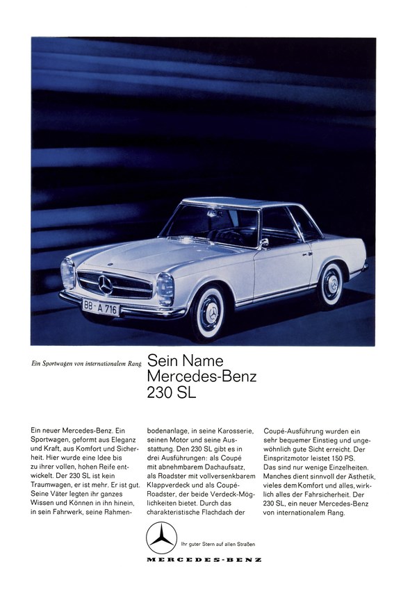 In a sense, the new model represented something of a compromise: the 230 SL, internally code named W 113, was neither an irredeemably tough roadster, nor a gentle boulevard-sports car – rather, it was a comfortable two-seated GT car with an excellent driving performance and maximum driving safety.