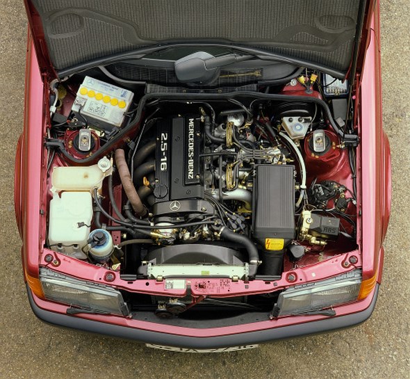 The 2.3-liter 4-cylinder engine with normal compression developed 136 hp. The 2.6-liter version with the 166 hp 6-cylinder engine from the 260 E was a minor sensation due to the fact that it had been possible to fit this engine into the 190.