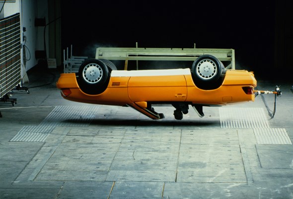 In the roof-drop test the body falls at a slight angle from a height of 50 centimetres onto the roof structure, and the car crashes onto one of the two A-pillars. Our accident research has shown that this drop height correlates very well with the drop height in actual overturns. Our company began conducting dynamic overturn tests as early as the end of the 1950s, with vehicles being driven one-sidedly over a ramp. We still conduct this today. It looks spectacular, but has the disadvantage that the impact tends to occur randomly and the results are therefore hardly reproducible.