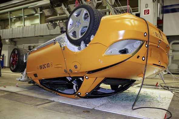 Of course. All vehicles from Mercedes-Benz Cars go through the same stringent development programme. This applies to the smart fortwo as well as to the S-Class and to cabriolets as well as saloons or SUVs. A total of 40 different crash test configurations must be passed by all cars. As well as the legally prescribed crash tests and ratings these also include additional internal crash tests which often have far stricter requirements – such as the roof-drop test.