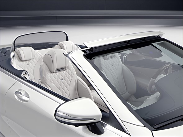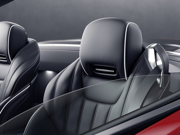 The neck-level heating system AIRSCARF is integrated into the backrests of the front seats and blows warm air out of outlets in the head restraints. AIRCAP consists of two components: an extending wind deflector with a net in the frame of the windscreen and a draught-stop behind the rear seats. The wind deflector raises the airflow, while the net increases the pressure level in the interior in a controlled manner, thus reducing the return flow, which is in turn slowed by the draught-stop and becomes more equal. This means that air movement in the interior is considerably reduced and a “sea of warm air” is created.