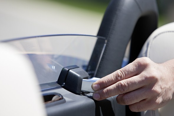 The three-layered fabric soft top is a weight-optimised magnesium /steel/ aluminium construction, and contributes greatly to the car’s low centre of gravity. The soft top has a seamlessly bonded rear window of heated single-layer safety glass. The flush, gap-free transition between the outer roof skin and the rear window keeps wind noise at a low level. A continuous, flexible water pocket running under the soft top catches rainwater and directs it to