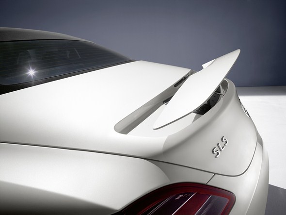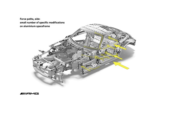In order to achieve handling dynamics identical to those of the Coupé, despite the lack of a fixed roof, the SLS AMG Roadster has features specifically designed to rigidify the bodyshell, for example side skirts with greater wall thicknesses and more chambers. The dashboard cross-member is supported against the windscreen frame and centre tunnel by additional struts, and a curved strut between the soft top and the tank reinforces the rear axle. To maintain stability despite the omission of the Coupé roof and gullwing doors, the open-top SLS AMG has a reinforcing cross-member behind the seats to support the fixed roll-over protection system. This also accommodates the 250 watt subwoofer of the optional Bang & Olufsen BeoSound AMG high-end sound system.
