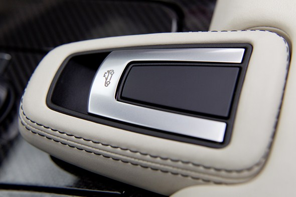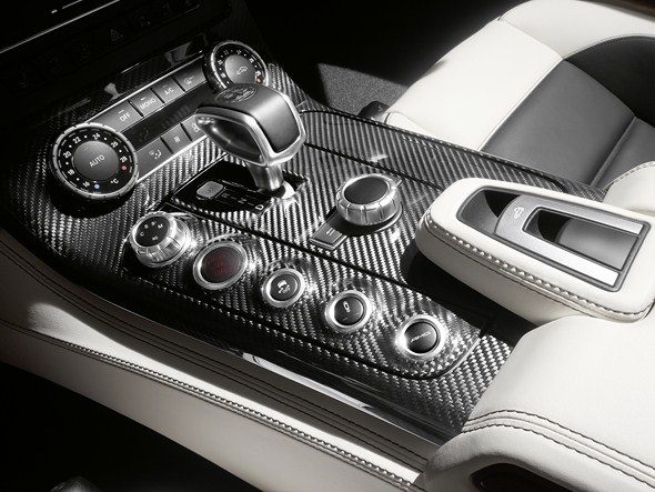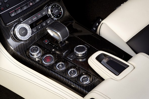 The modern, short-travel control keys in the SLS AMG require an operating force of only four newtons. All keys and switches are treated with Softtouch paint, which creates a silky sheen and a soft surface. The homogeneous, amber-coloured illumination of the control symbols ensures easy recognition, and also underlines the high-quality appearance of the interior when driving at night.