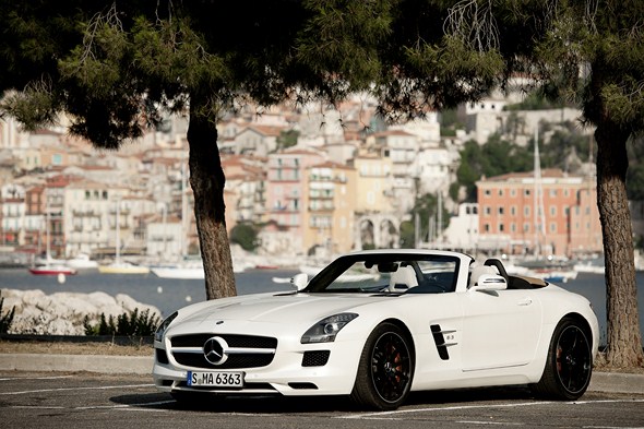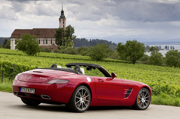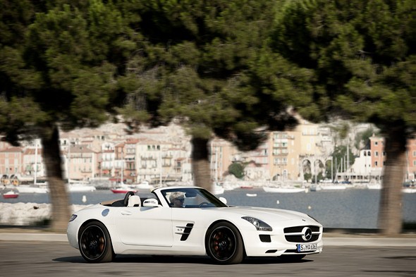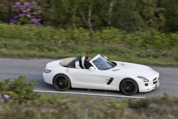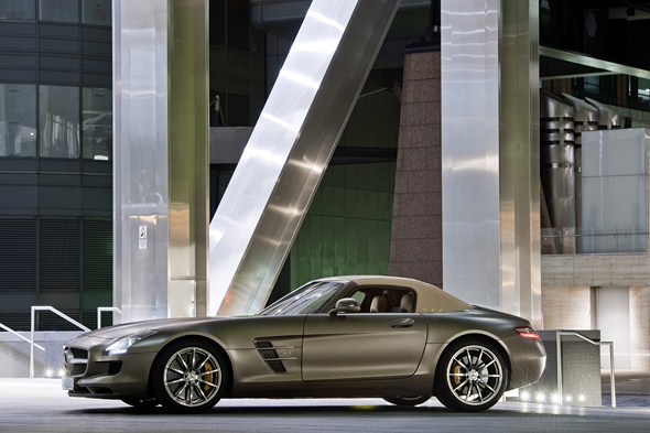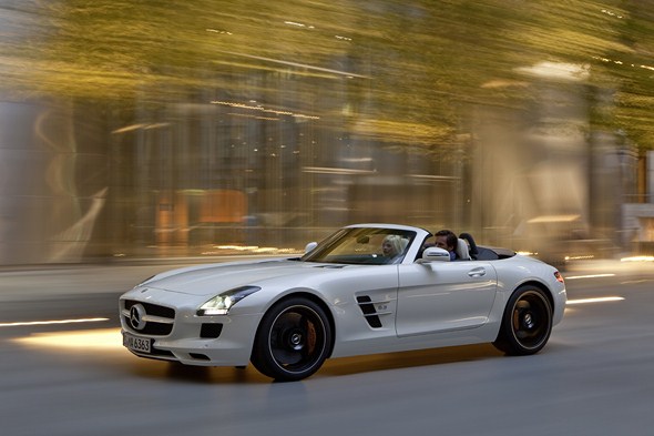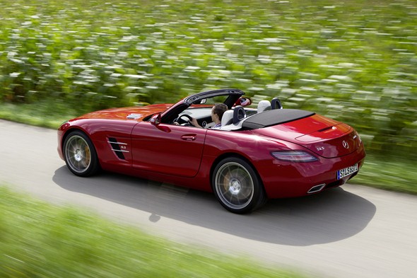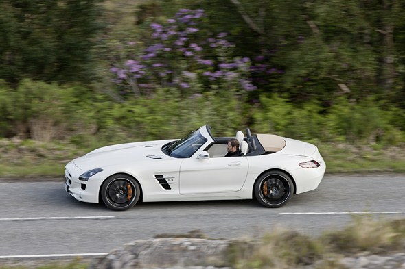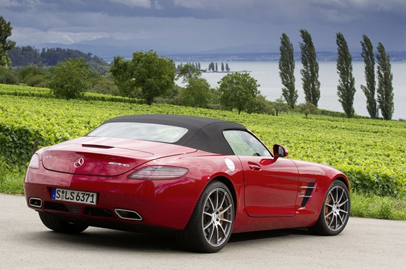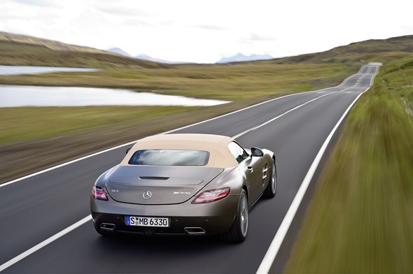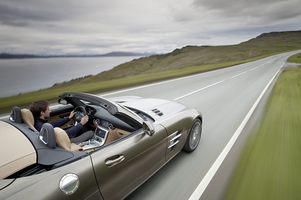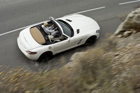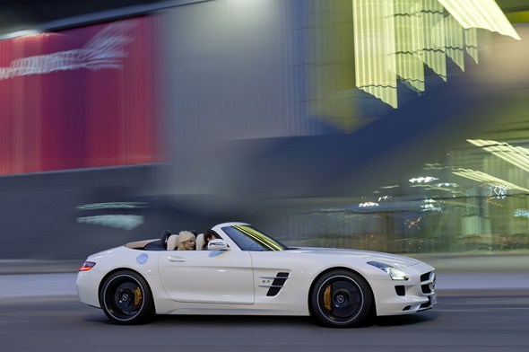 The compact fabric soft top of the SLS AMG Roadster opens and closes in just eleven seconds, and can be operated on the move at speeds up to 50 km/h.