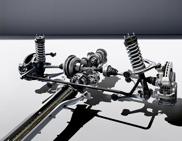 four wheels are located on double wishbones with a track rod, a technology that has proven itself in motor racing right through to Formula 1. With a double-wishbone axle, the wheel location and suspension functions remain separate; the spring/damper struts are supported on the lower wishbone. The double-wishbone concept with its high camber and track rigidity positively locates the wheel with minimal elastic movements, providing the driver with an optimum of road contact when driving at the limits.