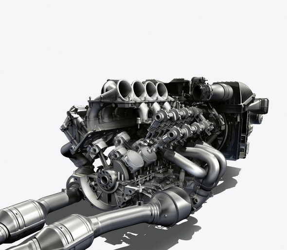 The high-revving V8 engine with a cubic capacity of 6208 cc has the typical characteristics of powerful racing engines. It responds immediately to accelerator movements and is extraordinarily willing. The use of a dry sump lubrication system makes for a considerably lower installed position in the vehicle. The resulting, lower centre of gravity allows high lateral acceleration and ensures thrilling driving dynamics.