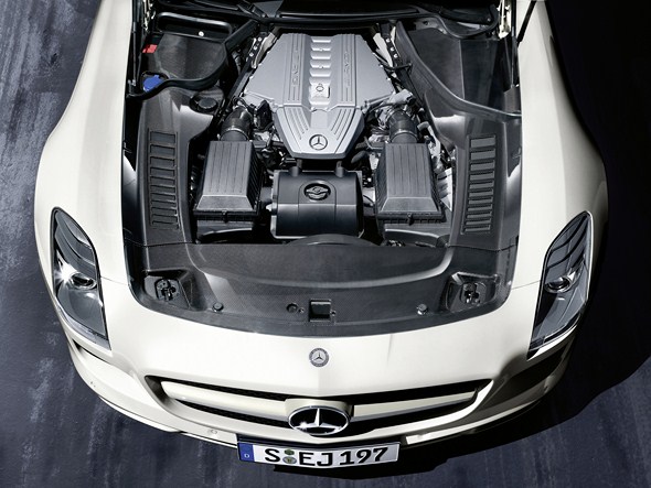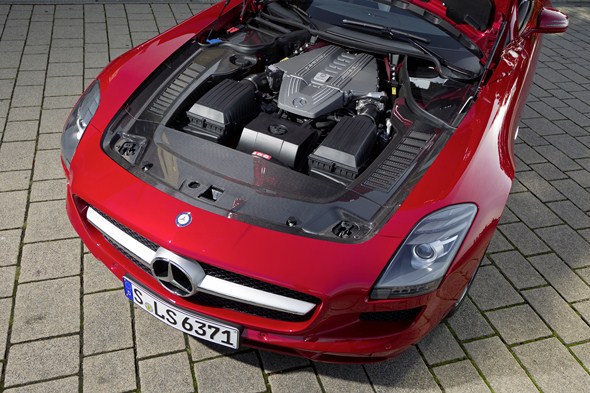The SLS AMG Roadster has the same, muscular engine as the gullwing model. The 6.3-litre V8 with a peak output of 420 kW (571 hp) at 6800 rpm makes