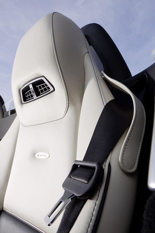 The standard appointments of the SLS AMG Roadster include black designo leather, AMG sports seats with heating, a slot-in draught-stop, COMAND APS with DVD player, anti-theft alarm system with tow-away protection and interior monitoring, THERMOTRONIC luxury automatic climate control and the KEYLESS-GO starting function. The optionally available AIRSCARF® system exclusive to Mercedes-Benz acts like an invisible scarf warming the head and neck areas of the occupants. It is integrated into the backrests of the AMG sports seats, and blows warm air from vents in the head restraints. Leather-lined roll-over bars with integrated mesh are available in conjunction with