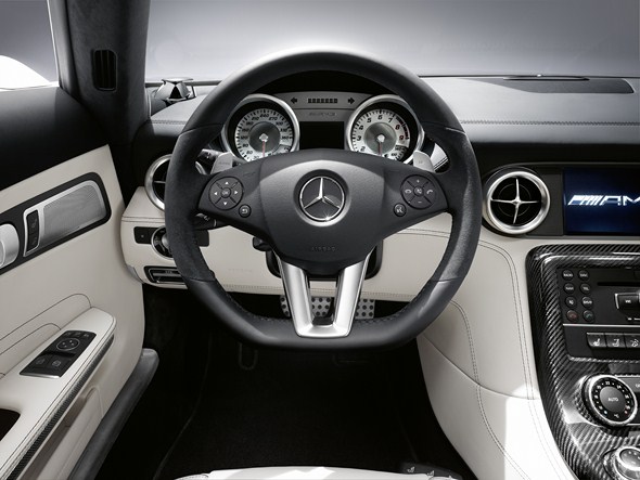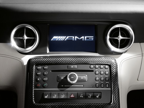 The standard appointments of the SLS AMG Roadster include black designo leather, AMG sports seats with heating, a slot-in glass draught-stop, COMAND APS with DVD player, anti-theft alarm system with tow-away protection and interior monitoring, THERMOTRONIC luxury automatic climate control and the KEYLESS-GO starting function.
