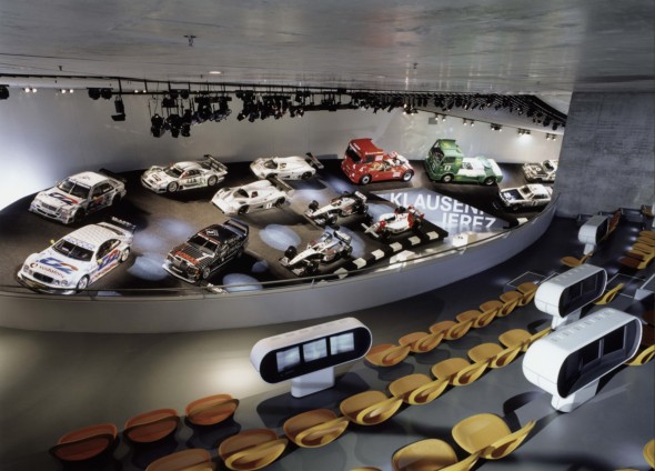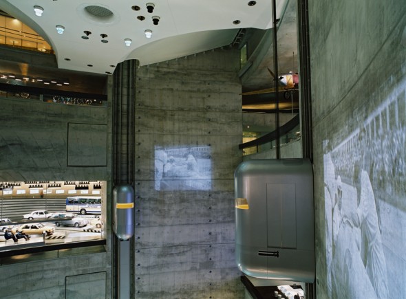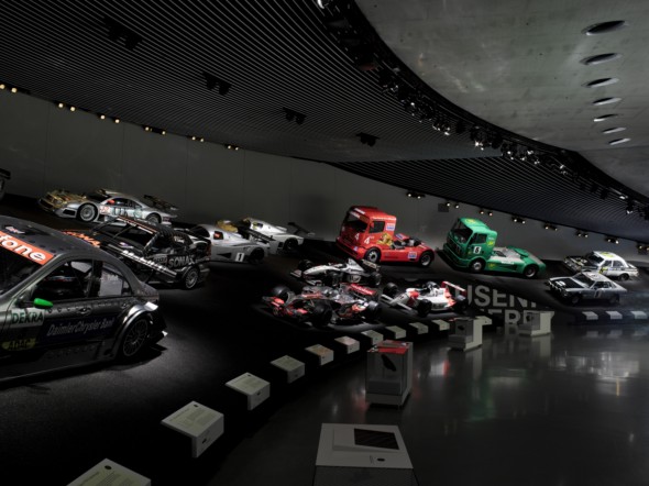 The banked curve gradually becomes a vertical wall on which famous record-breaking cars are mounted – from the record-breaking W 125 of 1938 to the solar-powered Solarmobile, which won the Tour de Sol from Lake Constance to Lake Geneva in the mid 1980s. At the centre of this cylindrical display, five platforms rise from the lower level of the connecting building, displaying experimental vehicles past and present.