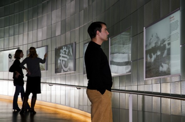 At the core of the exhibition and entirely surrounding the space is a double-walled glass façade. This display case contains high-tech exhibits drawn from everyday Mercedes-Benz technology. When the visitor stands in front of the glass display, flat screens appear as if by magic to provide background information.
