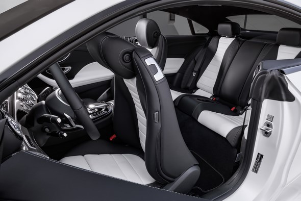 The interior boasts features such as seats in high-grade ARTICO/DINAMICA microfibre in black with grey contrasting topstitching, the Seat Comfort package, ambience lighting and an AMG leather sport steering wheel. Additional individualisation options for both lines come courtesy of the Night Package with a host of design details in high-gloss black.
