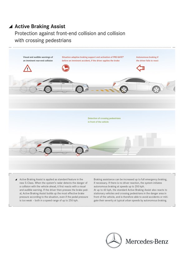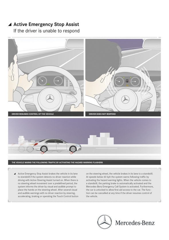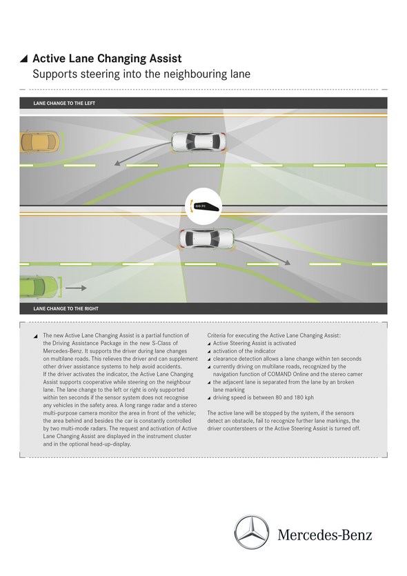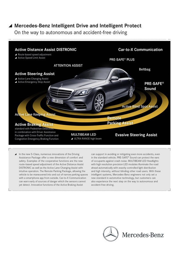 The new S-Class takes another major step towards autonomous driving, elevating Mercedes-Benz Intelligent Drive to the next level. DISTRONIC Active Proximity Control and Active Steer Assist now provide even more comfortable support for the driver to keep a safe distance and steer. The speed is now adjusted automatically ahead of curves or junctions. This is complemented by a considerably improved Active Lane Change Assist and additional functions of the Active Emergency Stop Assist.