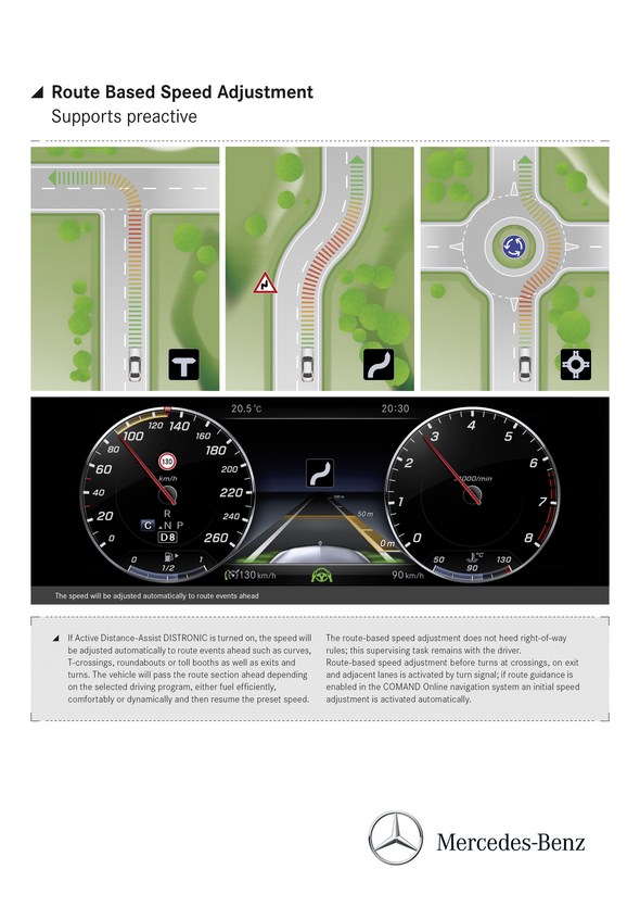DISTRONIC Active Proximity Assist uses substantially more map and navigation data, can support the driver based on the route, and conveniently adjusts the vehicle speed.