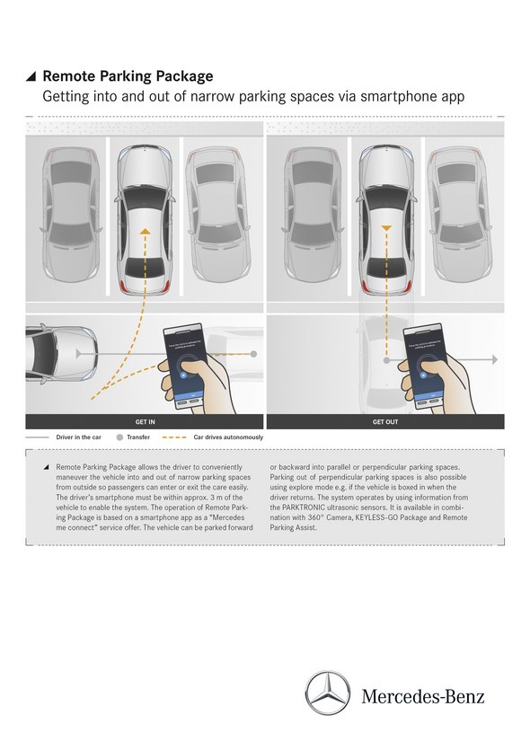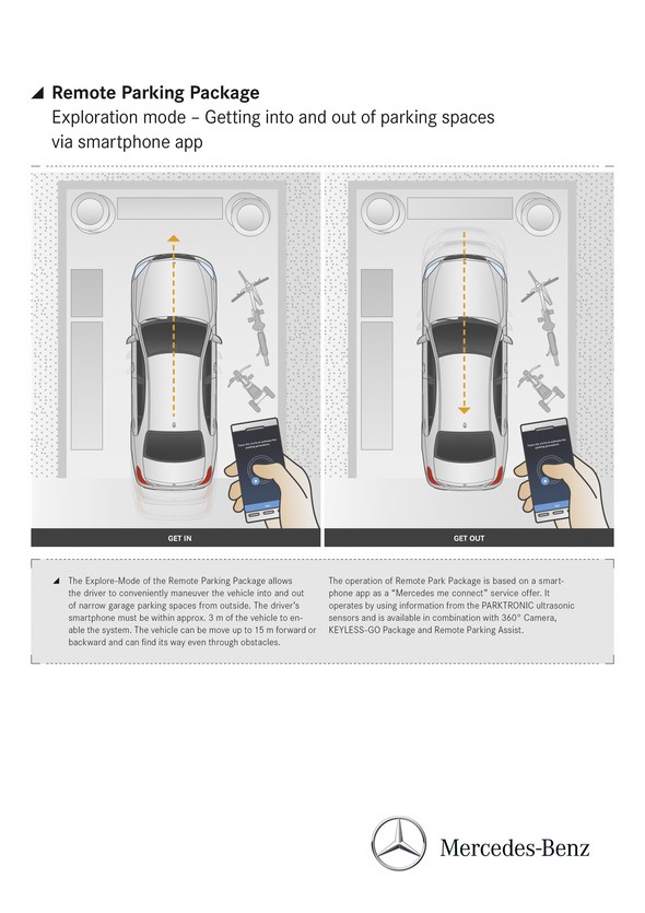 Depending on the respective applicable national road traffic regulations, Remote Parking Assist enables the driver to manoeuvre the vehicle into tight parking spaces or garages by smartphone, so as to facilitate getting in and out. The vehicle can be manoeuvred into parallel and end-on parking spaces in both forward and reverse direction. Manoeuvring out of end-on parking spaces is also possible, e.g. if the driver returns to their vehicle to find that it has been blocked in. In Explore mode, the vehicle can be manoeuvred forward and back for up to 15 metres and can avoid detected obstacles with small steering corrections in the process.