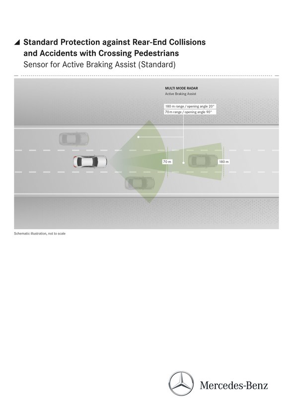 The “Assistance Graphics” menu of the instrument panel shows the driver at one glance which assistance functions he selected and to what situations the systems are currently responding. Unmistakable icons provide him with information on the screen as well in the head-up display. All functions are now controlled from the steering wheel. The new Driving Assistance package includes but is not limited to the following functions: