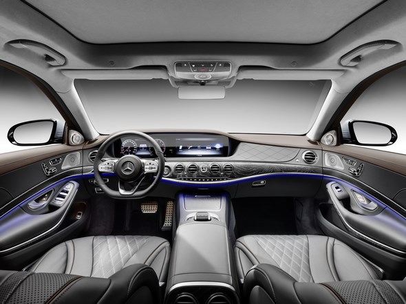 The interior of the new S-Class is characterised by the two new high-resolution displays, each with a screen diagonal of 12.3 inches. Visually, the two displays under one shared glass cover blend into a wide-screen cockpit and as a central element consequently emphasise the horizontal orientation of the interior design.