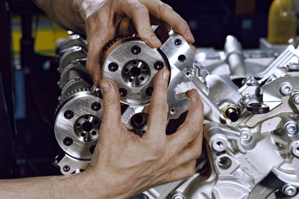 The 32 valves in the cylinder heads are operated by bucket tappets for a rigid valve train and high engine speeds a technology which has proved its worth in motor racing. Continuous adjustment of the camshafts on the intake and exhaust sides is another special feature of this up-to-date AMG V8 engine. The interior of this powerful new development conceals yet another genuine world first, too: as the worlds first regular production engine, the AMG 6.3-litre V8 engine features a special twin-wire-arc-sprayed (TWAS) coating on the cylinder walls, a new process which produces outstandingly low friction.