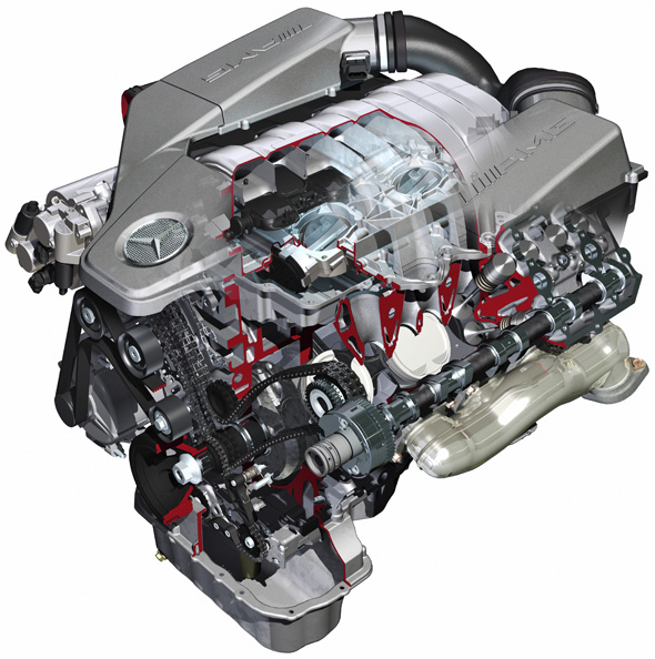 Apart from the large overall displacement, the extremely high output and torque is above all due to the sophisticated intake system a completely new departure for AMG. Its major characteristics are large cross-sections, the streamlined design of the entire intake and exhaust manifolds, and the vertical arrangement of all ducts in line with motor-racing practice. The newly developed and patented variable intake manifold, which is made of magnesium and has two parallel-action internal throttle flaps, is a world first. The combined action of these components, which are highly unusual in regular engine production, ensures perfect cylinder charging.